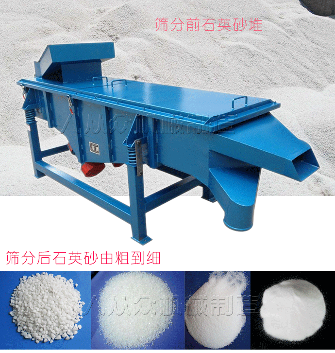 石英砂直線篩在振動(dòng)電機(jī)的帶動(dòng)下,石英砂跟隨著產(chǎn)生的直線推動(dòng)力做向前的直線跳躍運(yùn)動(dòng),顆粒小的會(huì)通過(guò)篩網(wǎng)落下去完成分級(jí)或者進(jìn)入下一次分級(jí)。