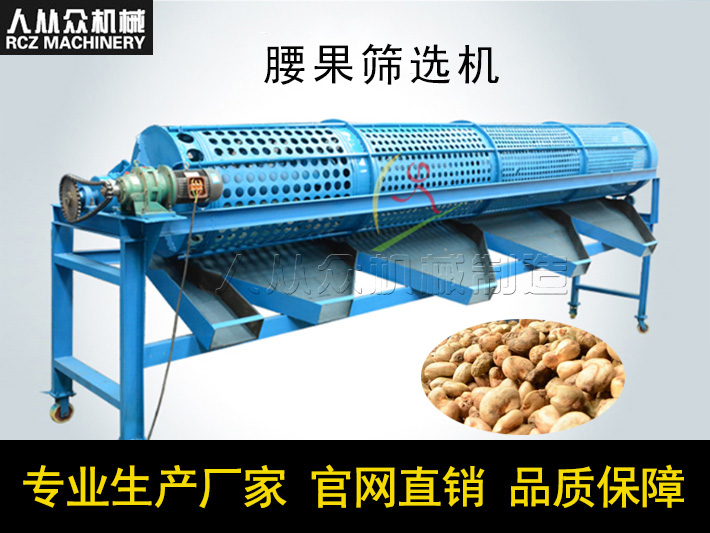 腰果篩分機(jī)/干果篩分機(jī)替代人工進(jìn)行大小的分揀,目前我司生產(chǎn)的腰果滾筒篩長度可達(dá)12米,篩分量大、效果佳。