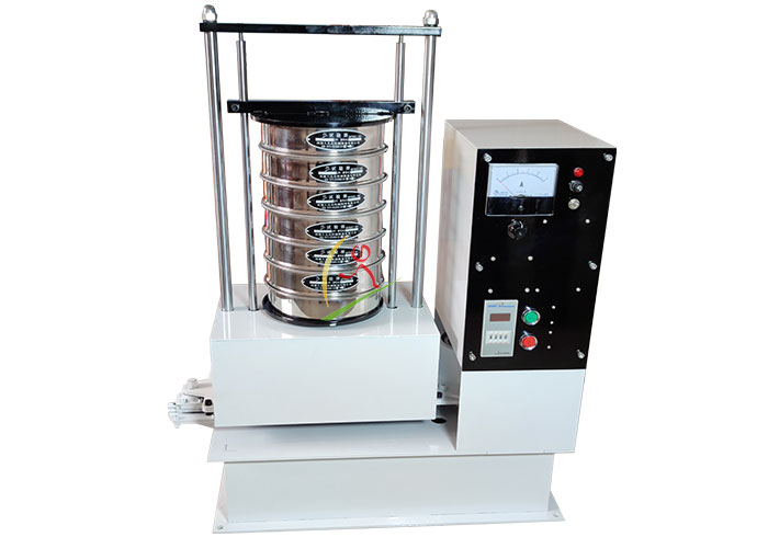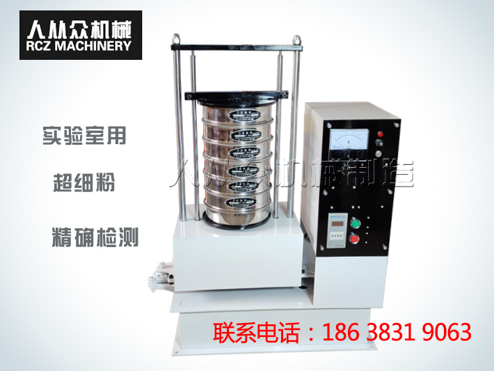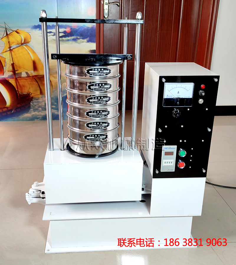 磁懸浮式振動篩通電后電磁裝置形成磁場,起振裝置懸浮在磁場中間,形成了上下高頻振動,再通過底部托盤傳導(dǎo)到安放在托盤上的一套從粗到細排列的篩具上,使得實驗篩、分樣篩中的物料上下、左右往返振動及運動,使每層實驗篩、分樣篩內(nèi)只留下相同粒度的物料,達到了不同粒度的分離。